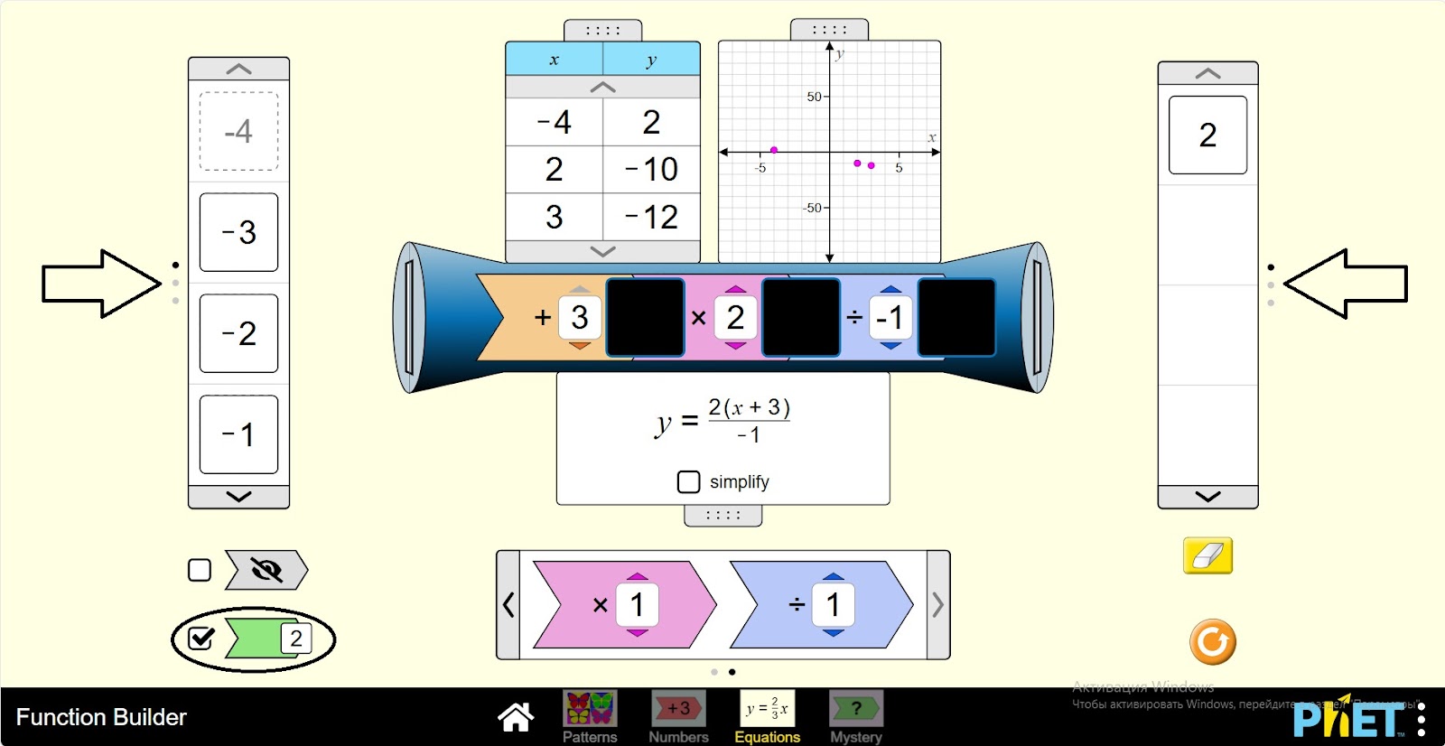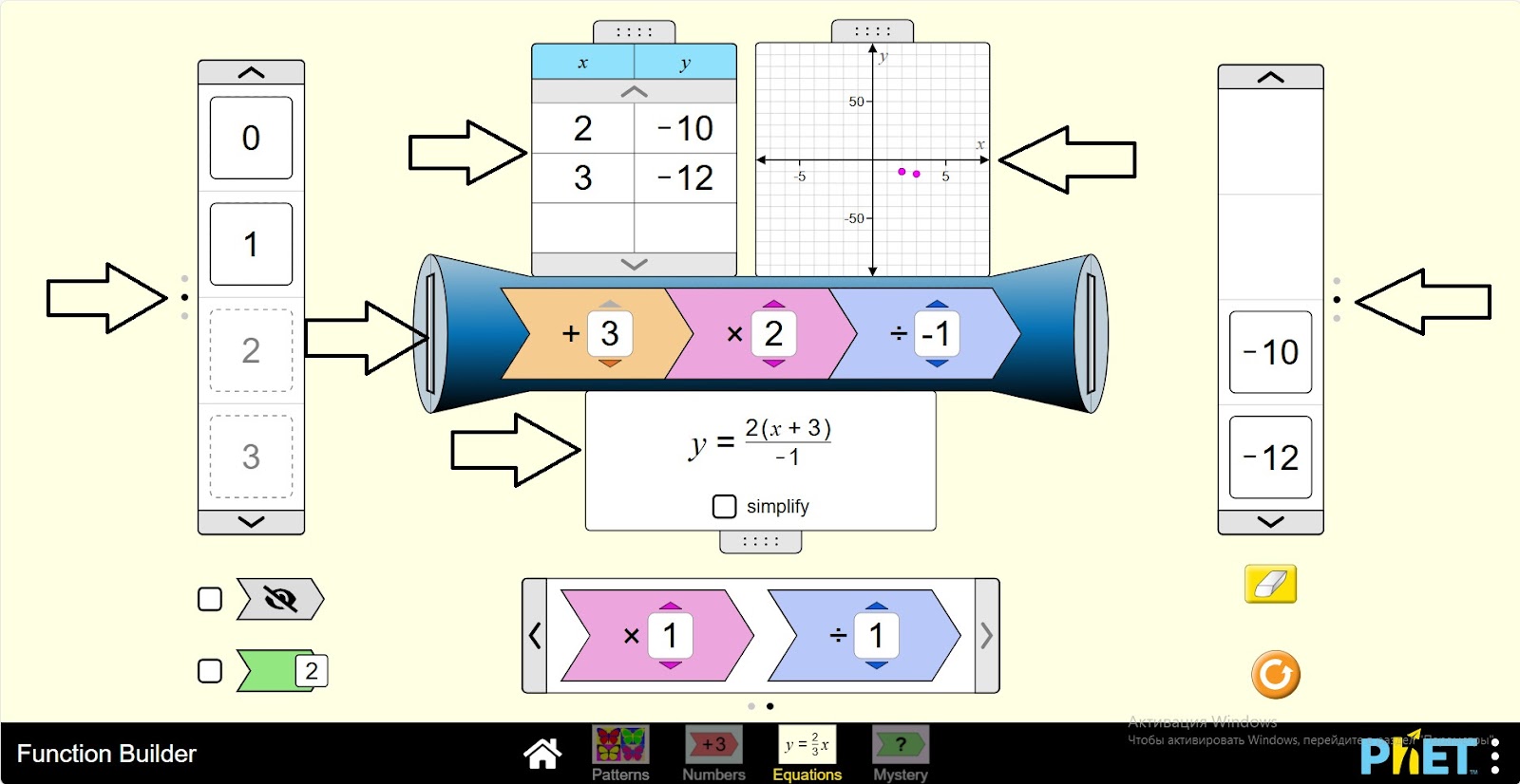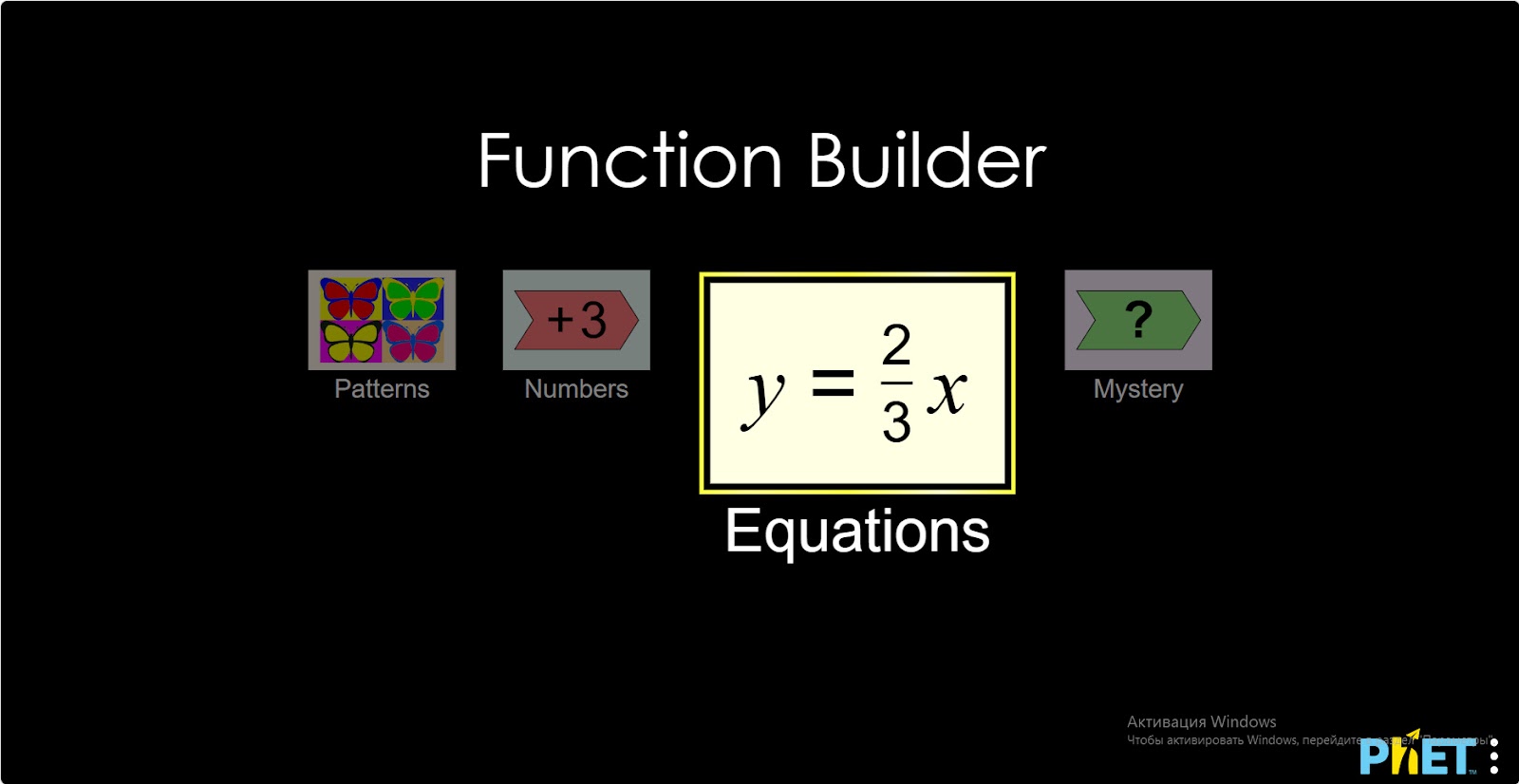 Шаг 1. Запустите симуляцию: вам будет предложено 4 различных режима:“Patterns”, “Numbers”, “Equations” и “Mystery”. Вы будете работать над этим экспериментом в разделе “Equations”. Откройте раздел «Equations».