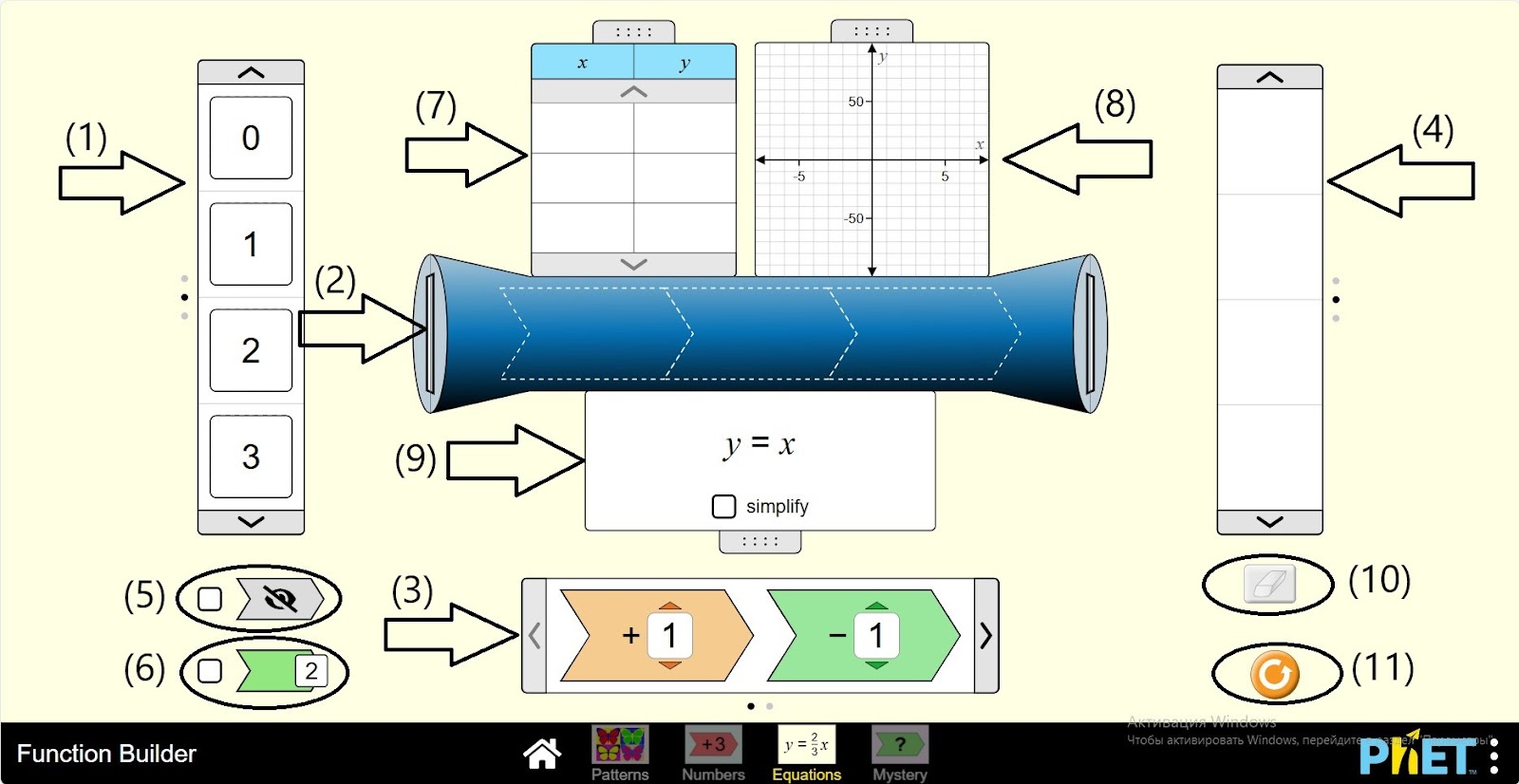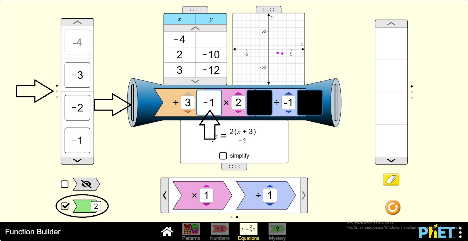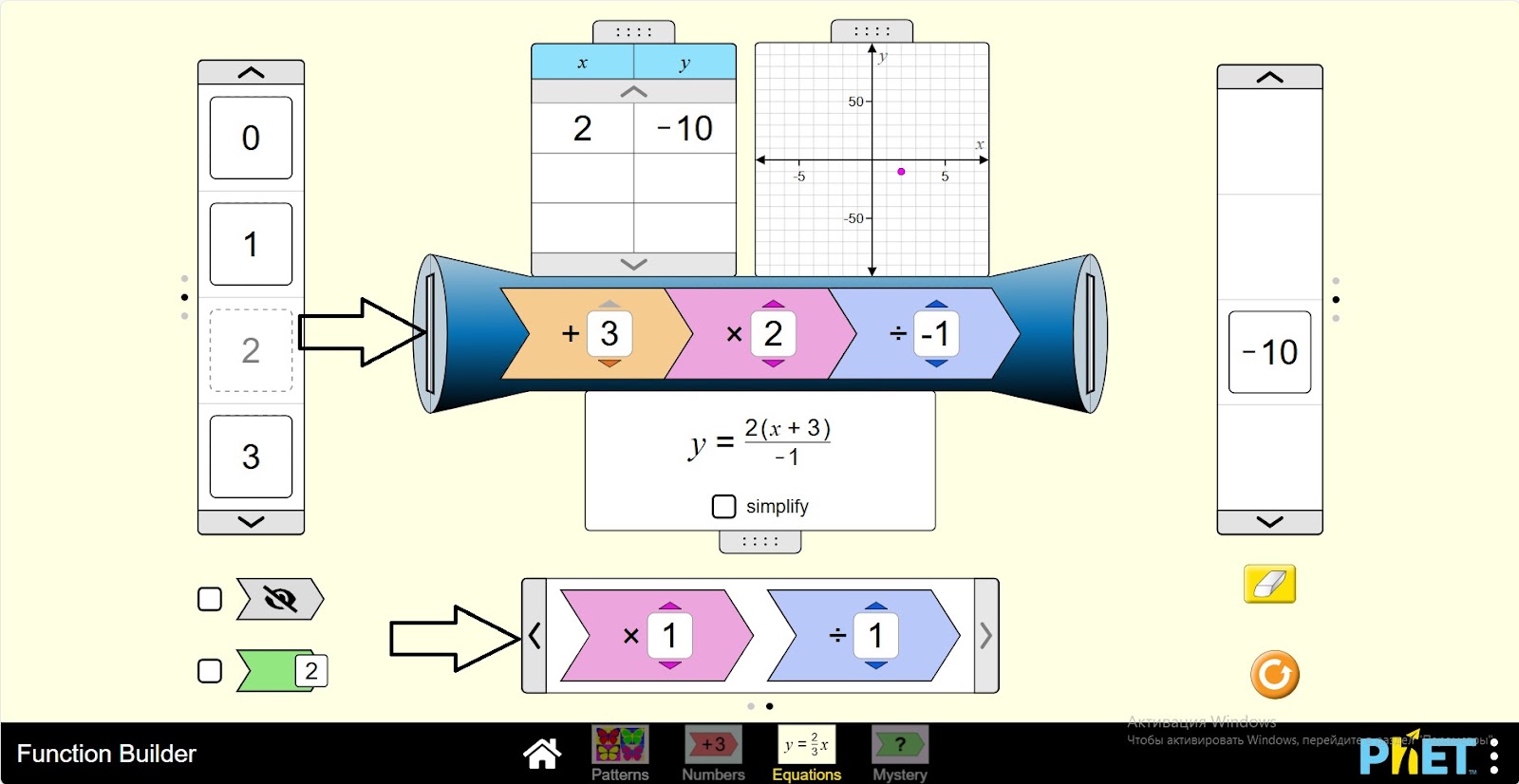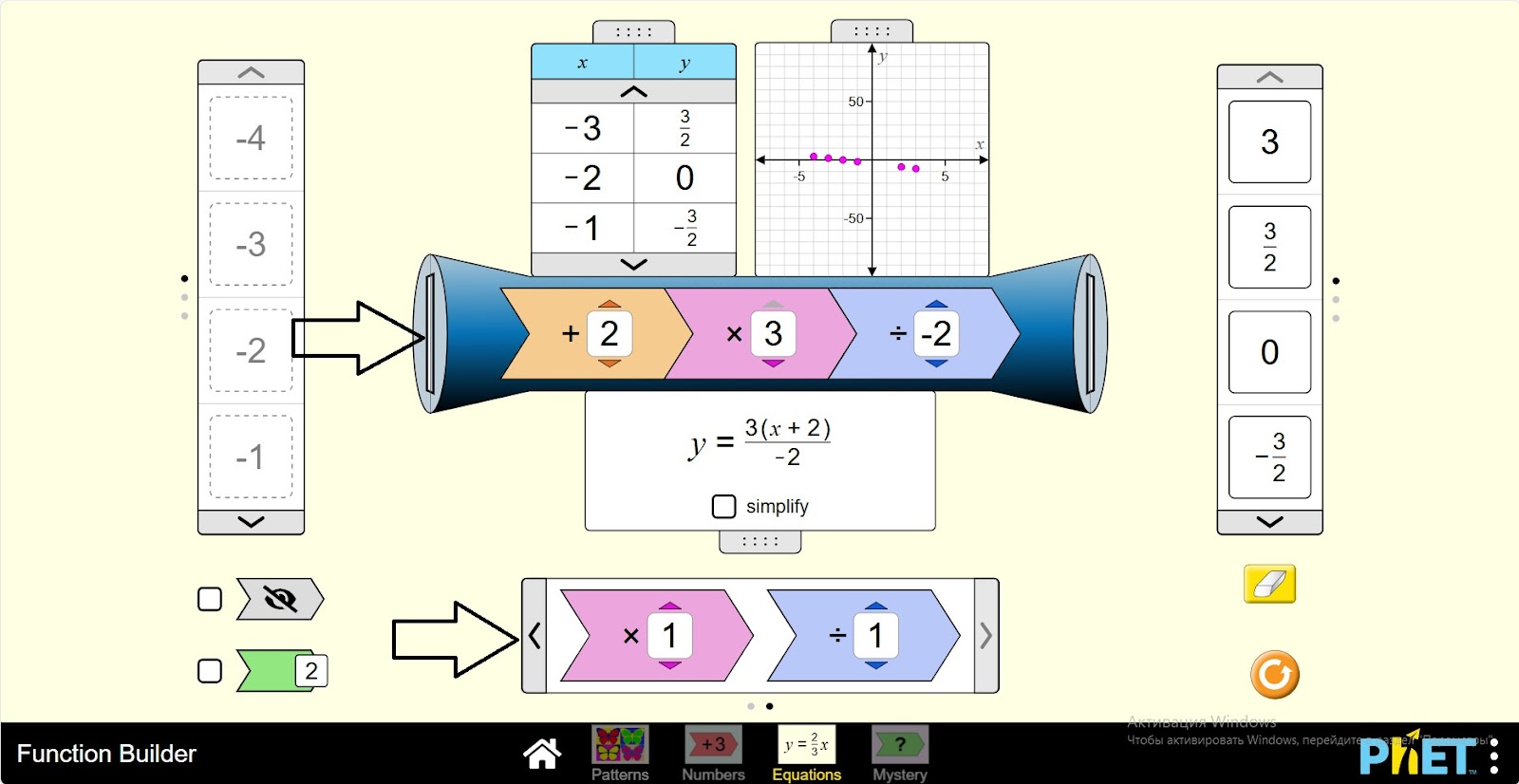 Шаг 1. Запустите симуляцию: вам будет предложено 4 различных режима:“Patterns”, “Numbers”, “Equations” и “Mystery”. Вы будете работать над этим экспериментом в разделе “Equations”. Откройте раздел «Equations».