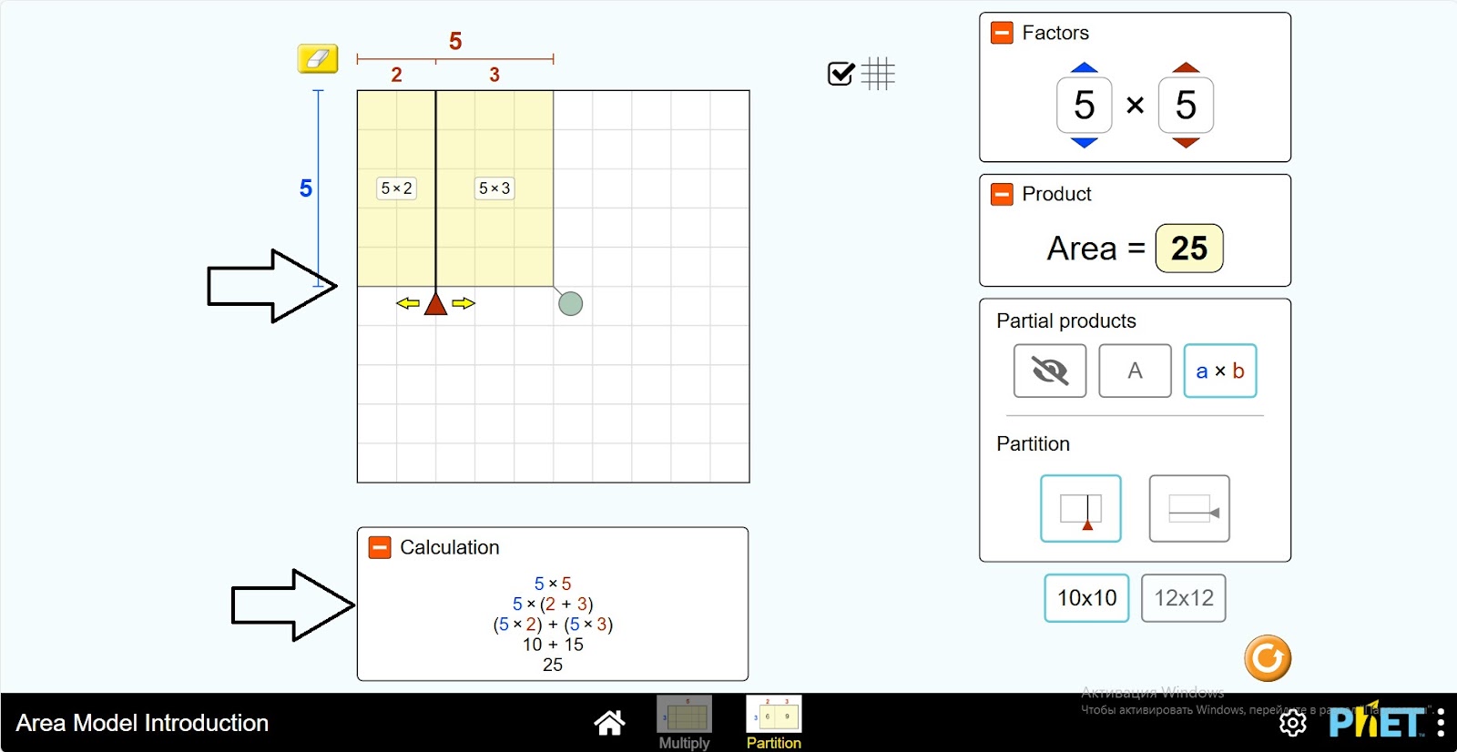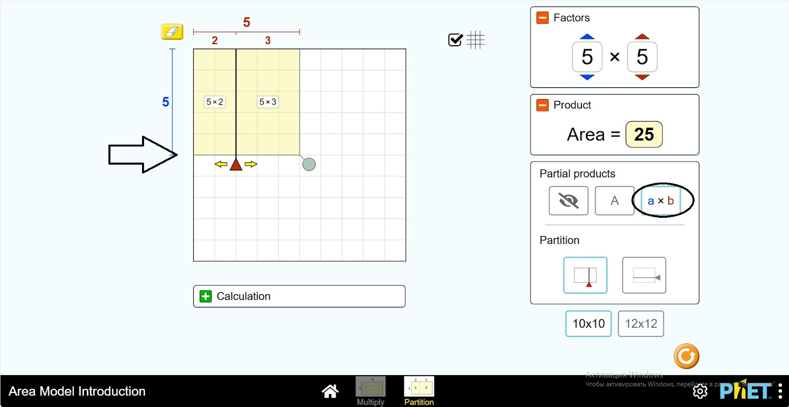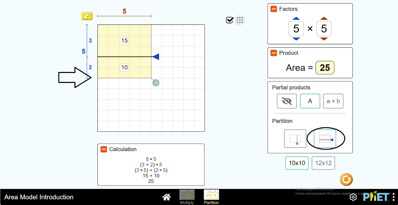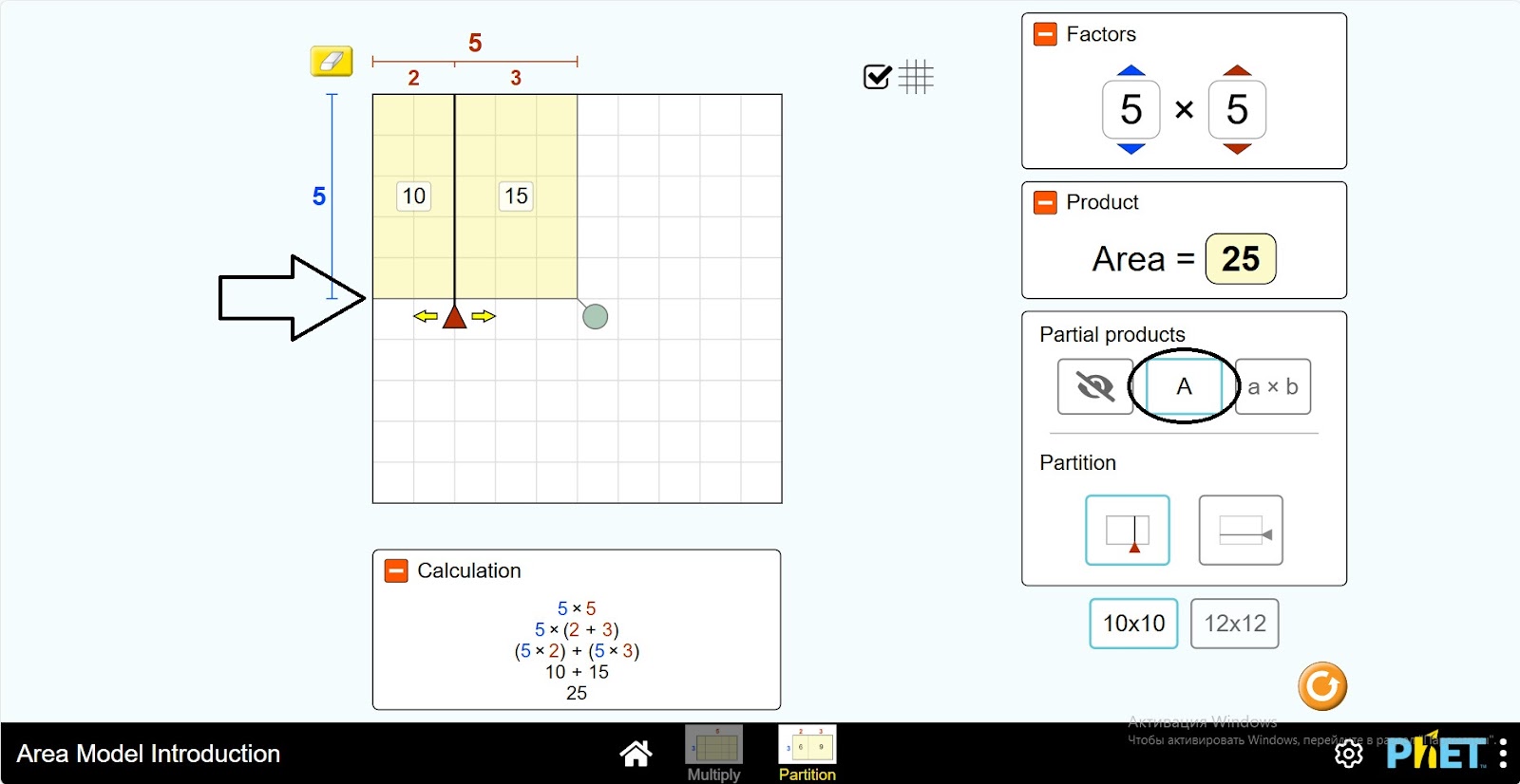 Шаг 1. Запустите симуляцию: вам будет предложено 2 различных режима: “Multiply” и “Partition”. Вы будете работать над этим экспериментом в разделе “Partition”. Откройте раздел “Partition”.