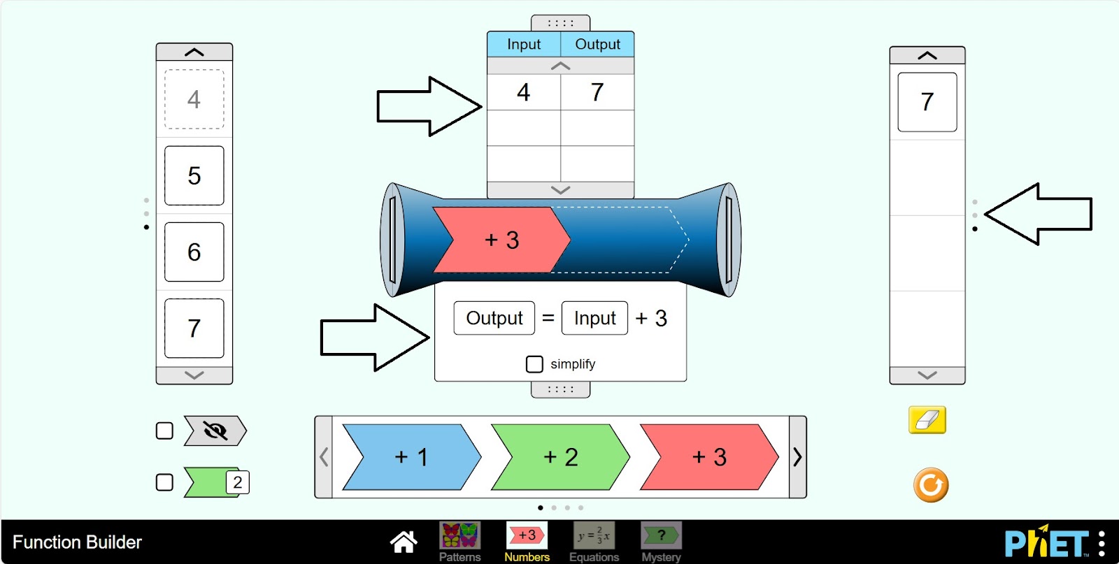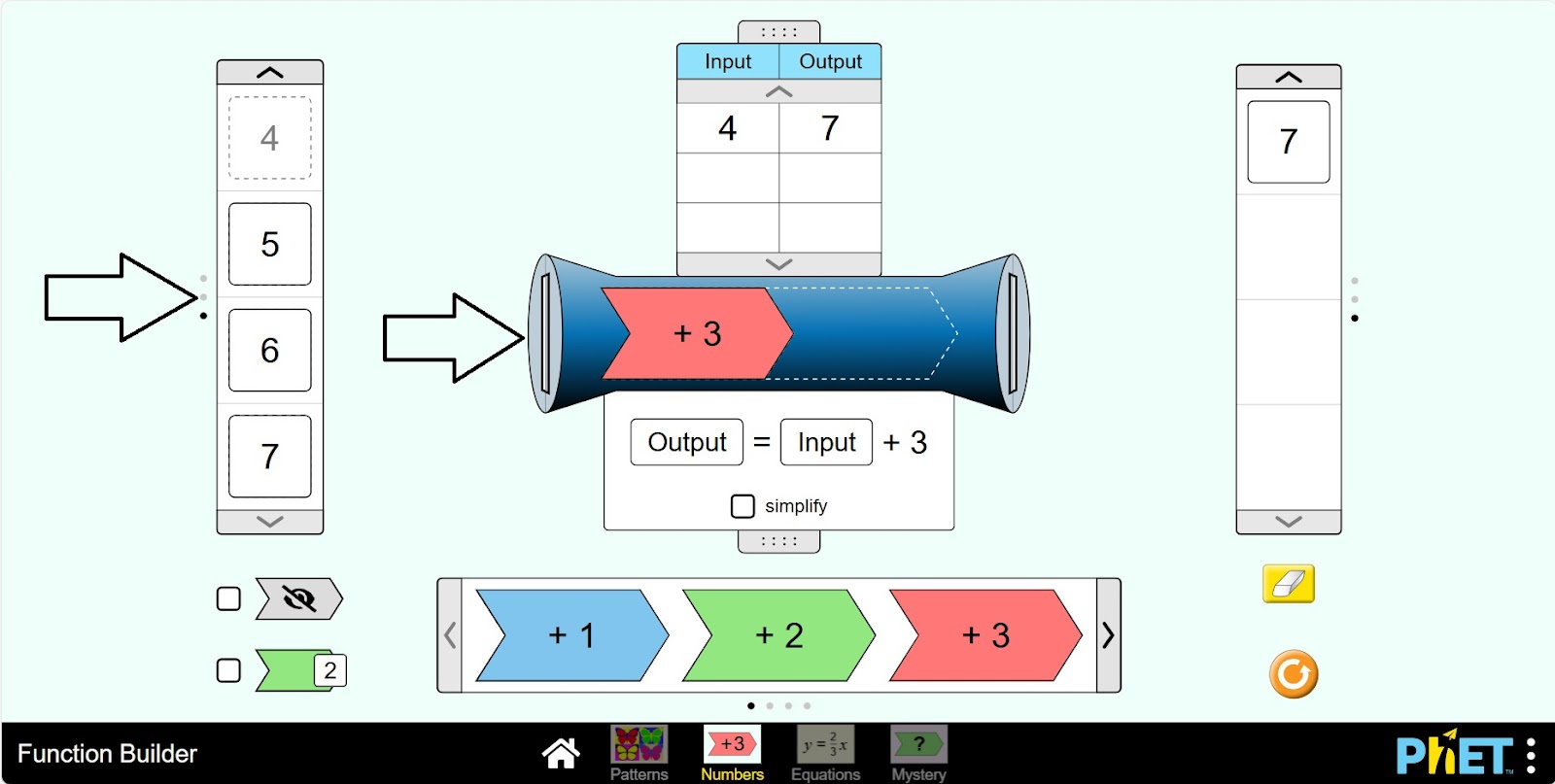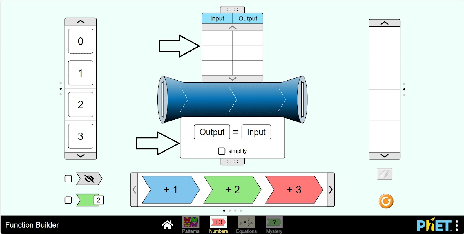 Шаг 1. Запустите симуляцию: вам будет предложено 4 различных режима: “Patterns”, “Numbers”, “Equations” и “Mystery”. Вы будете работать над этим экспериментом в разделе “Numbers”. Откройте раздел “Numbers”.