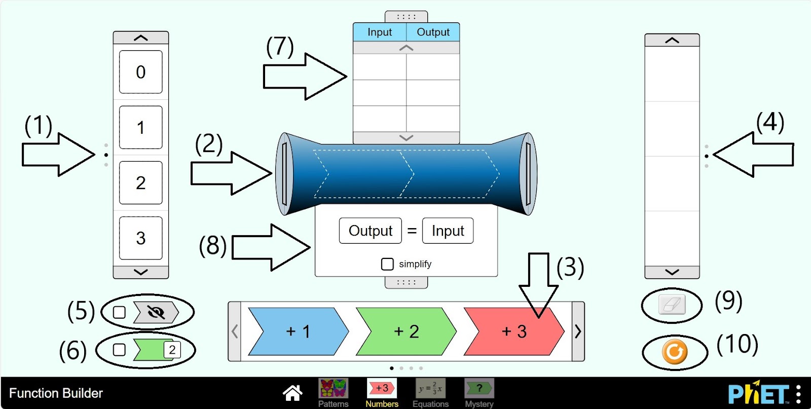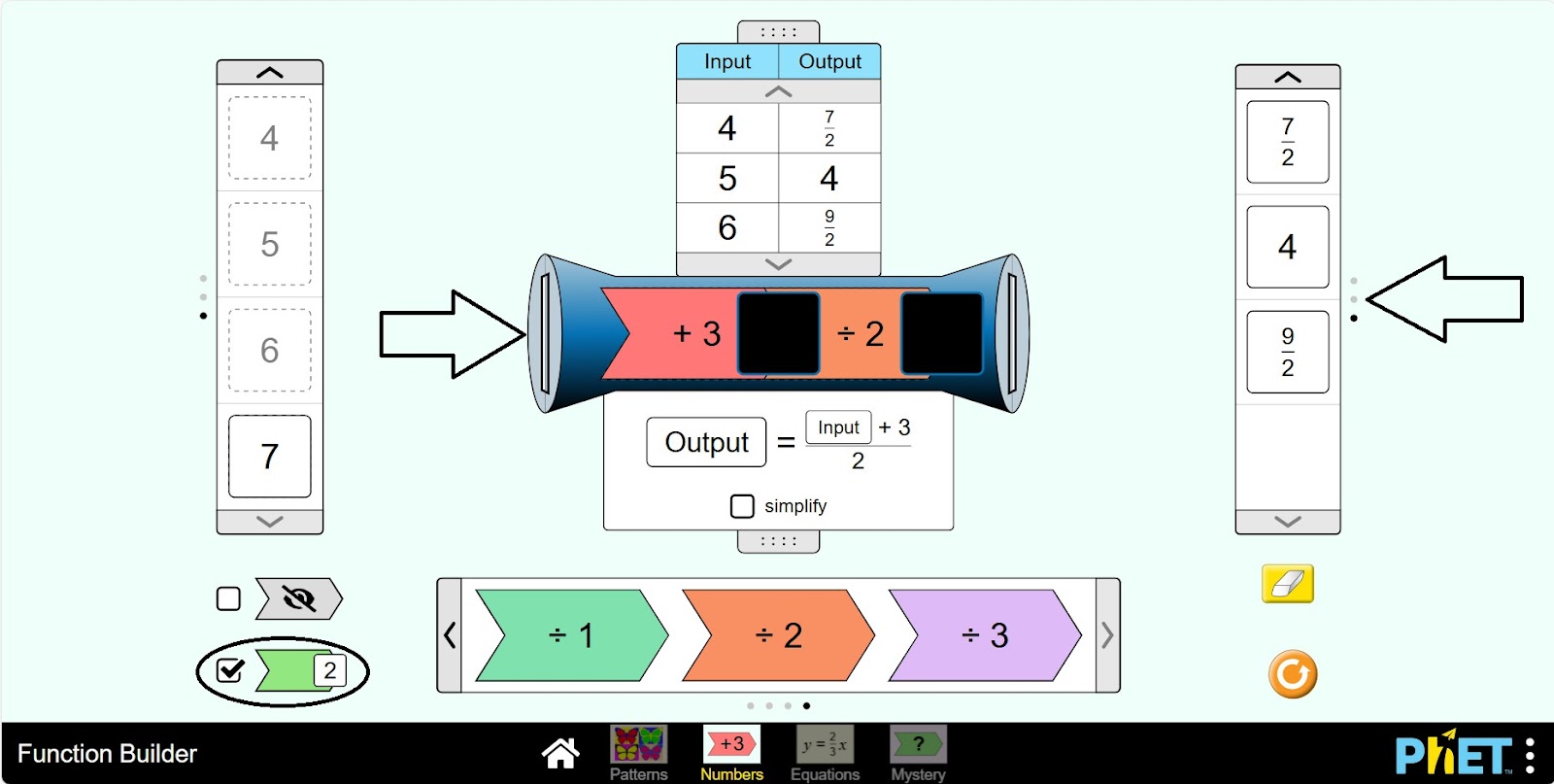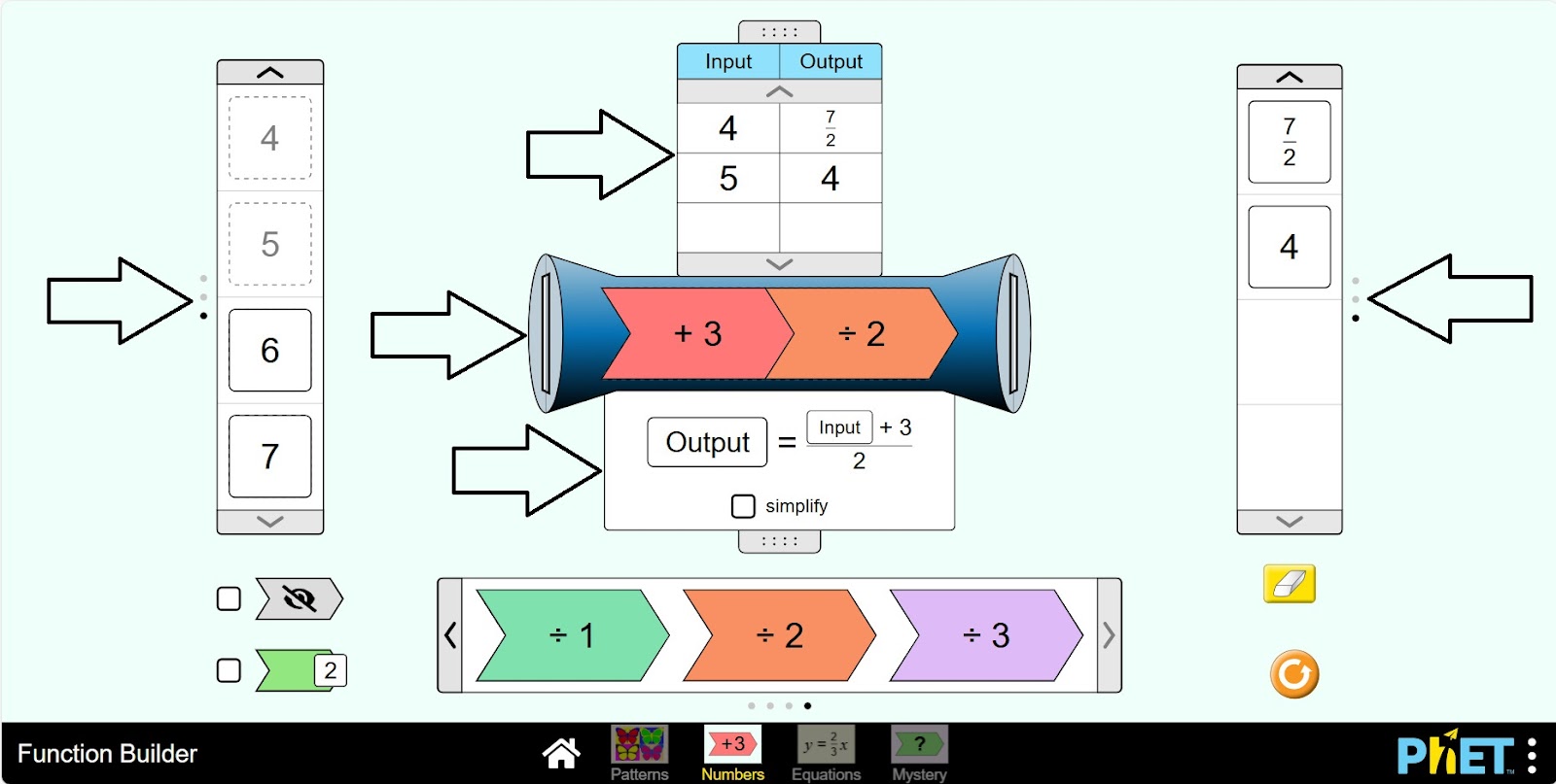 Шаг 1. Запустите симуляцию: вам будет предложено 4 различных режима: “Patterns”, “Numbers”, “Equations” и “Mystery”. Вы будете работать над этим экспериментом в разделе “Numbers”. Откройте раздел “Numbers”.