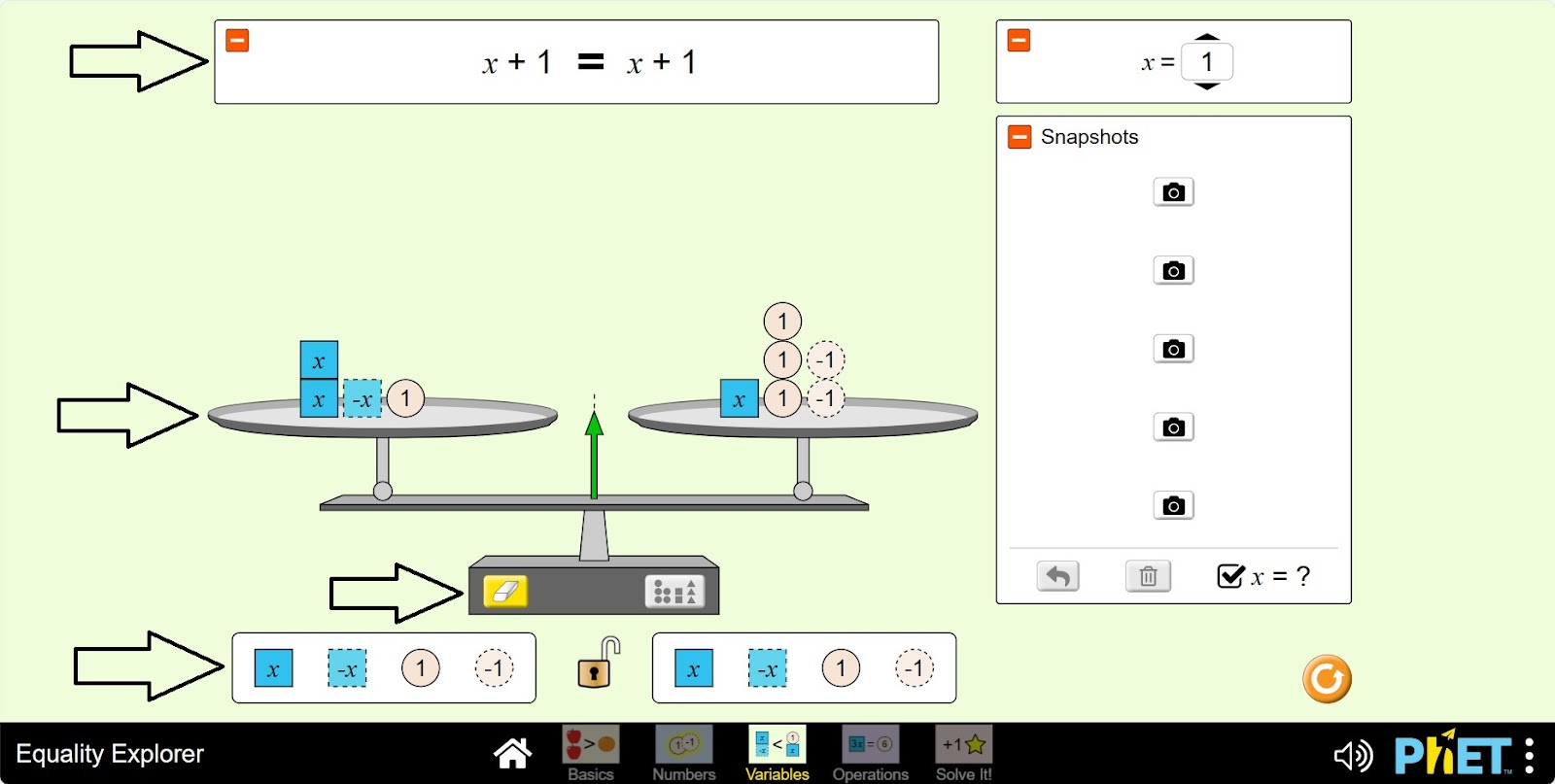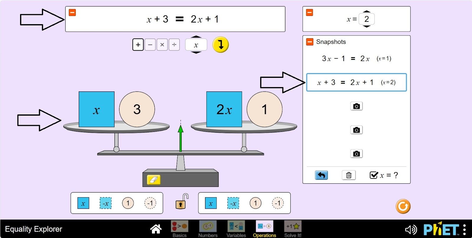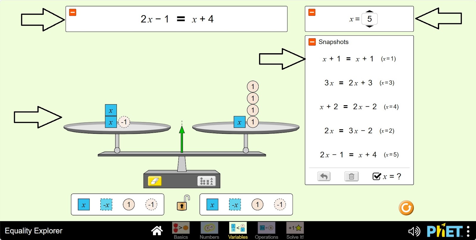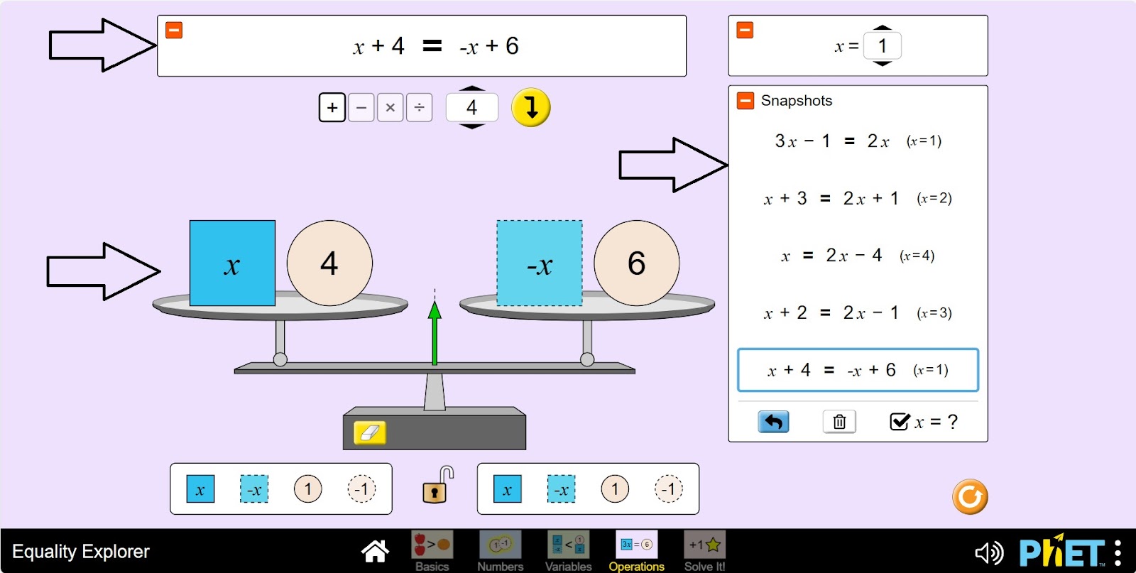 Симулятор «Уравнение» позволяет учащимся исследовать понятие уравнения, неравенства и переменных. На экране «Переменные» учащиеся изучают, как различные значения переменной влияют на состояние равенства. На экране «Вычисления» учащиеся могут построить неравенство или уравнение и применить универсальные операции, чтобы узнать, что произойдет с каждым членом, а также узнать, как отменить операцию.