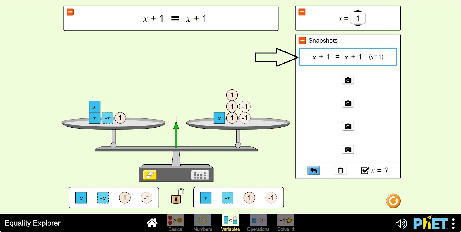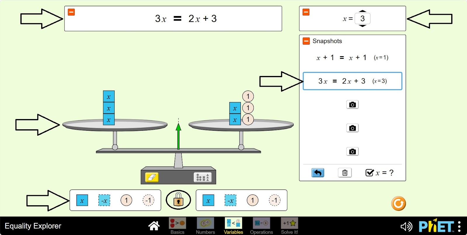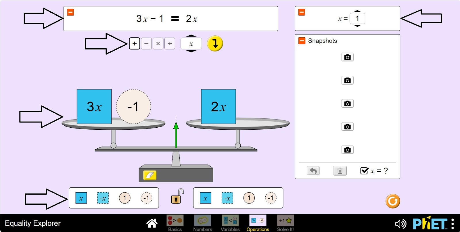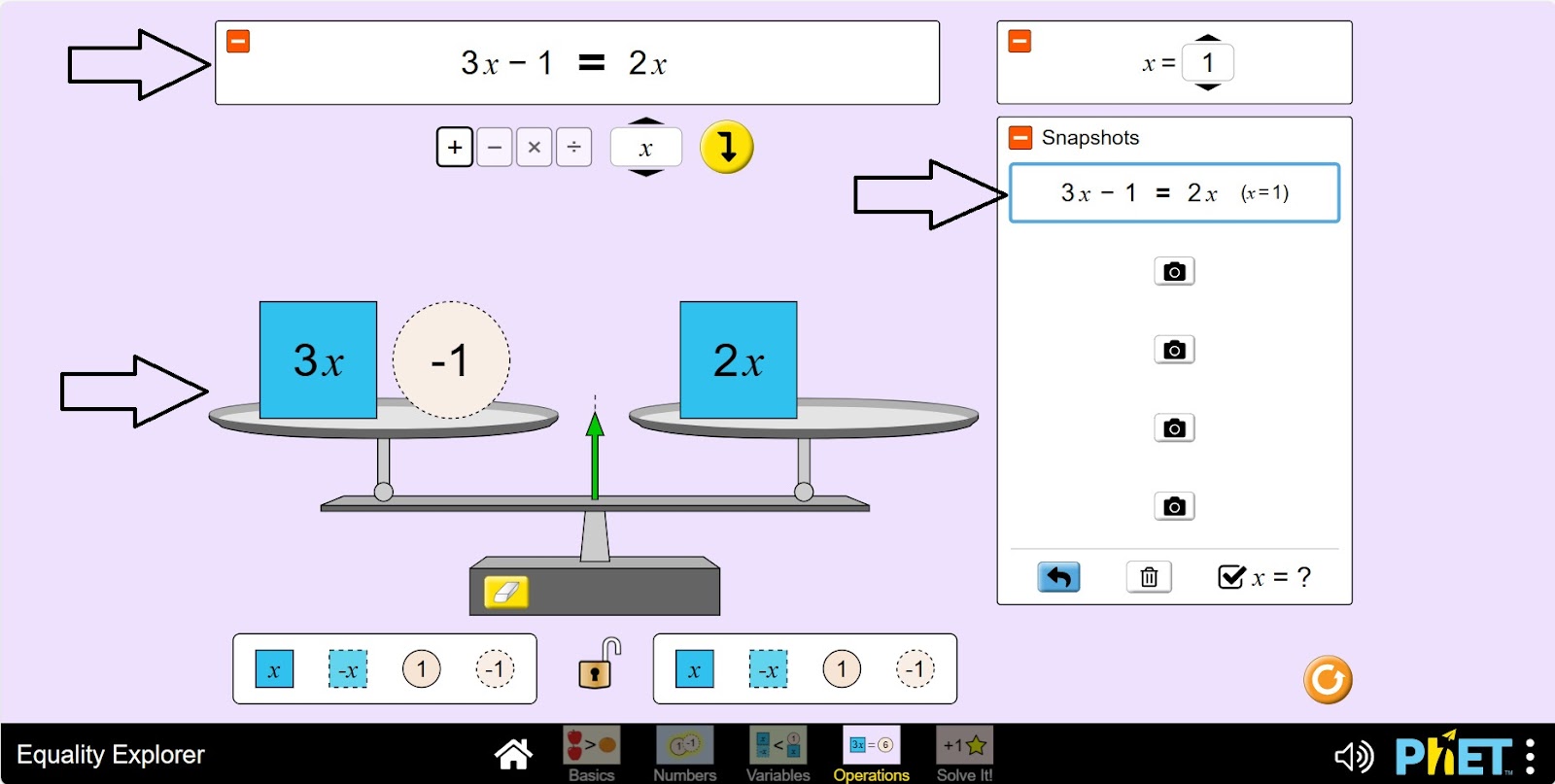 Симулятор «Уравнение» позволяет учащимся исследовать понятие уравнения, неравенства и переменных. На экране «Переменные» учащиеся изучают, как различные значения переменной влияют на состояние равенства. На экране «Вычисления» учащиеся могут построить неравенство или уравнение и применить универсальные операции, чтобы узнать, что произойдет с каждым членом, а также узнать, как отменить операцию.