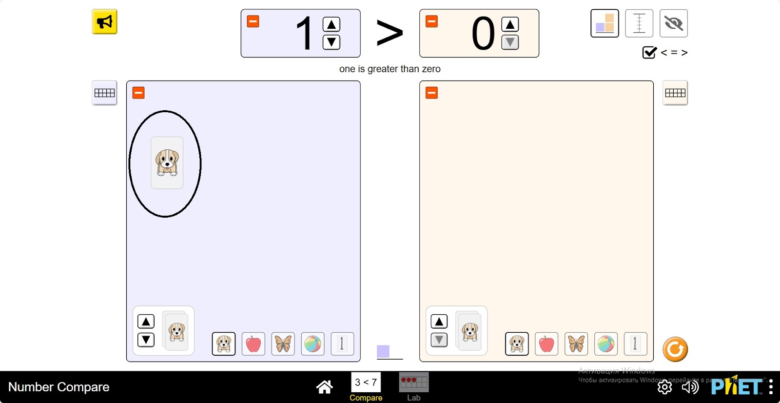 Шаг 8. Сделайте несколько сравнений, поместив щенка в два окна для размещения предметов разного количества.