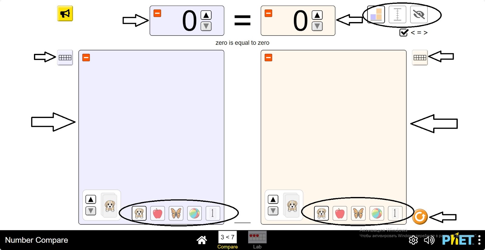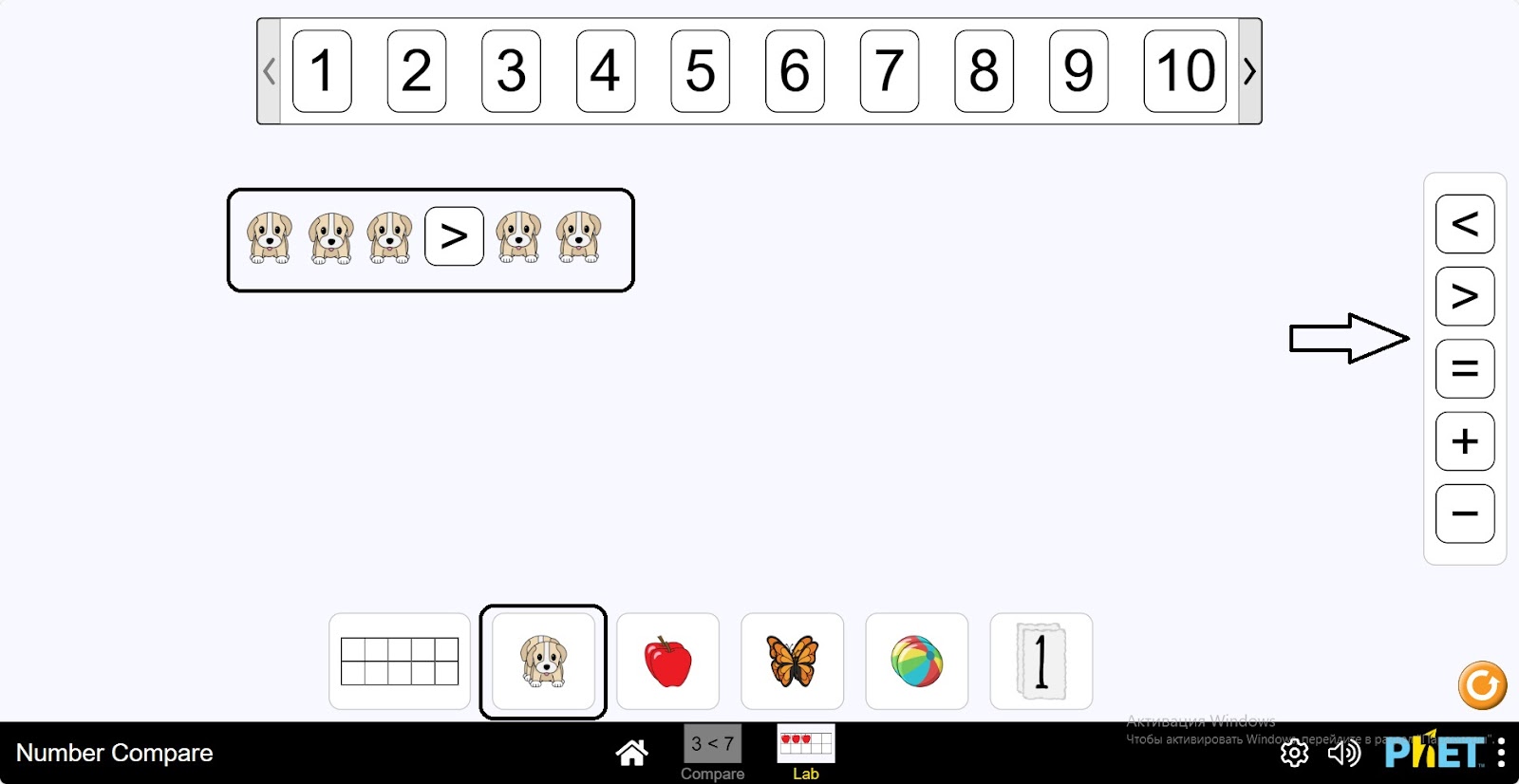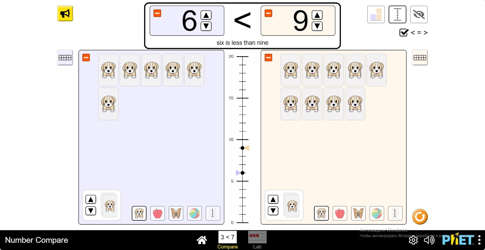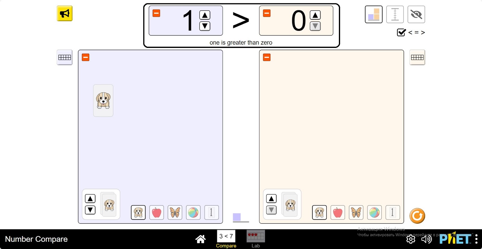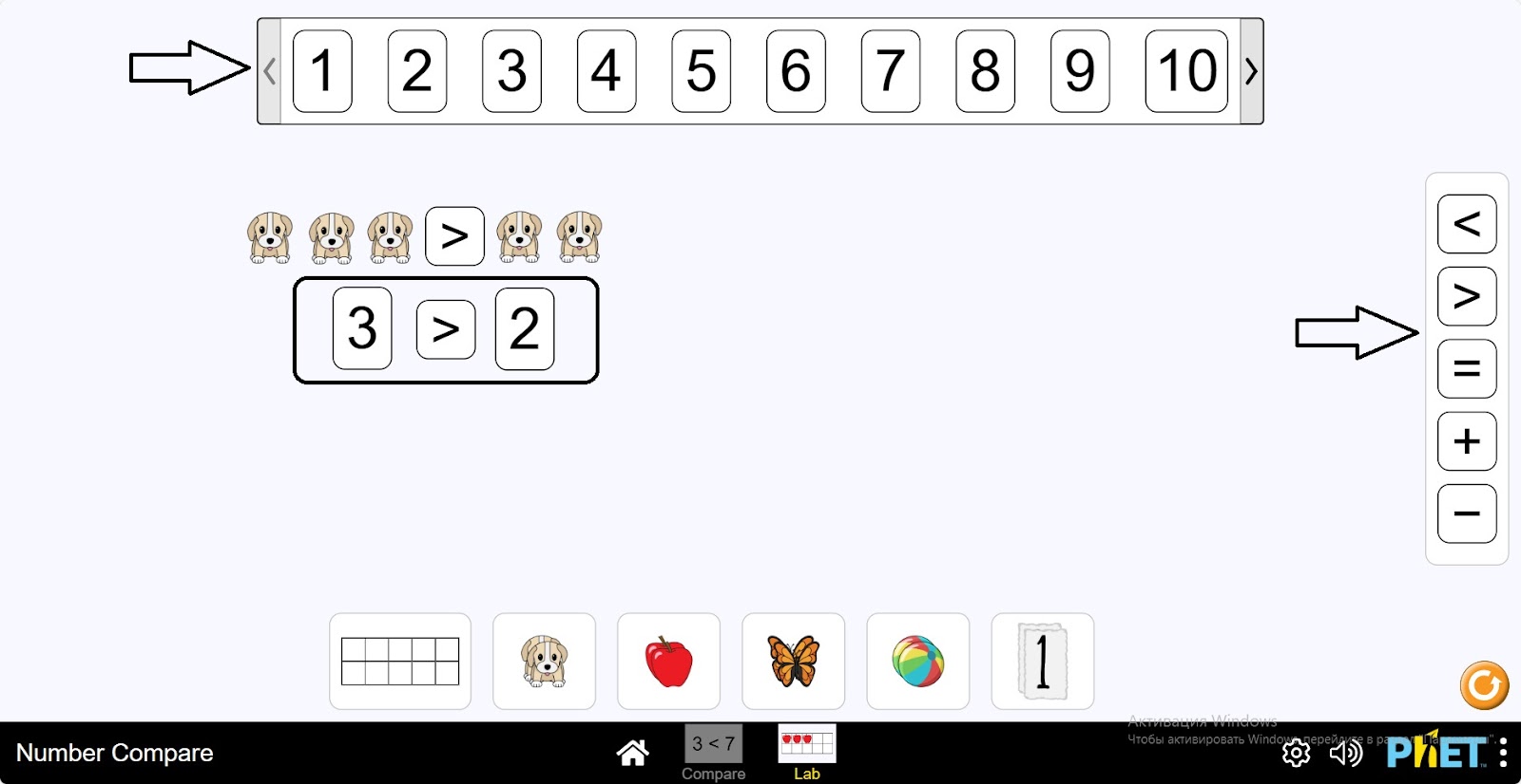 - Два окна для размещения предметов (щенок, яблоко, бабочка, мяч, число) и их сравнения.