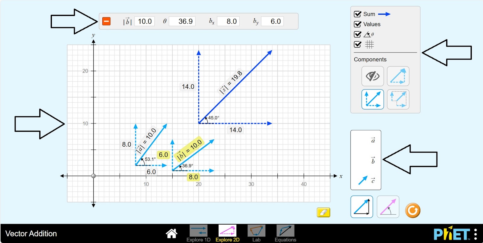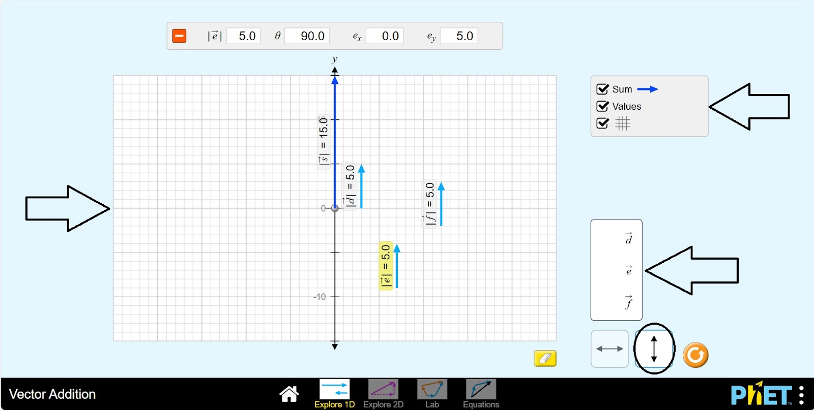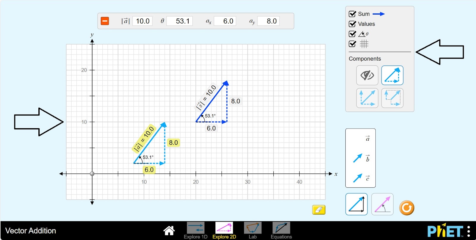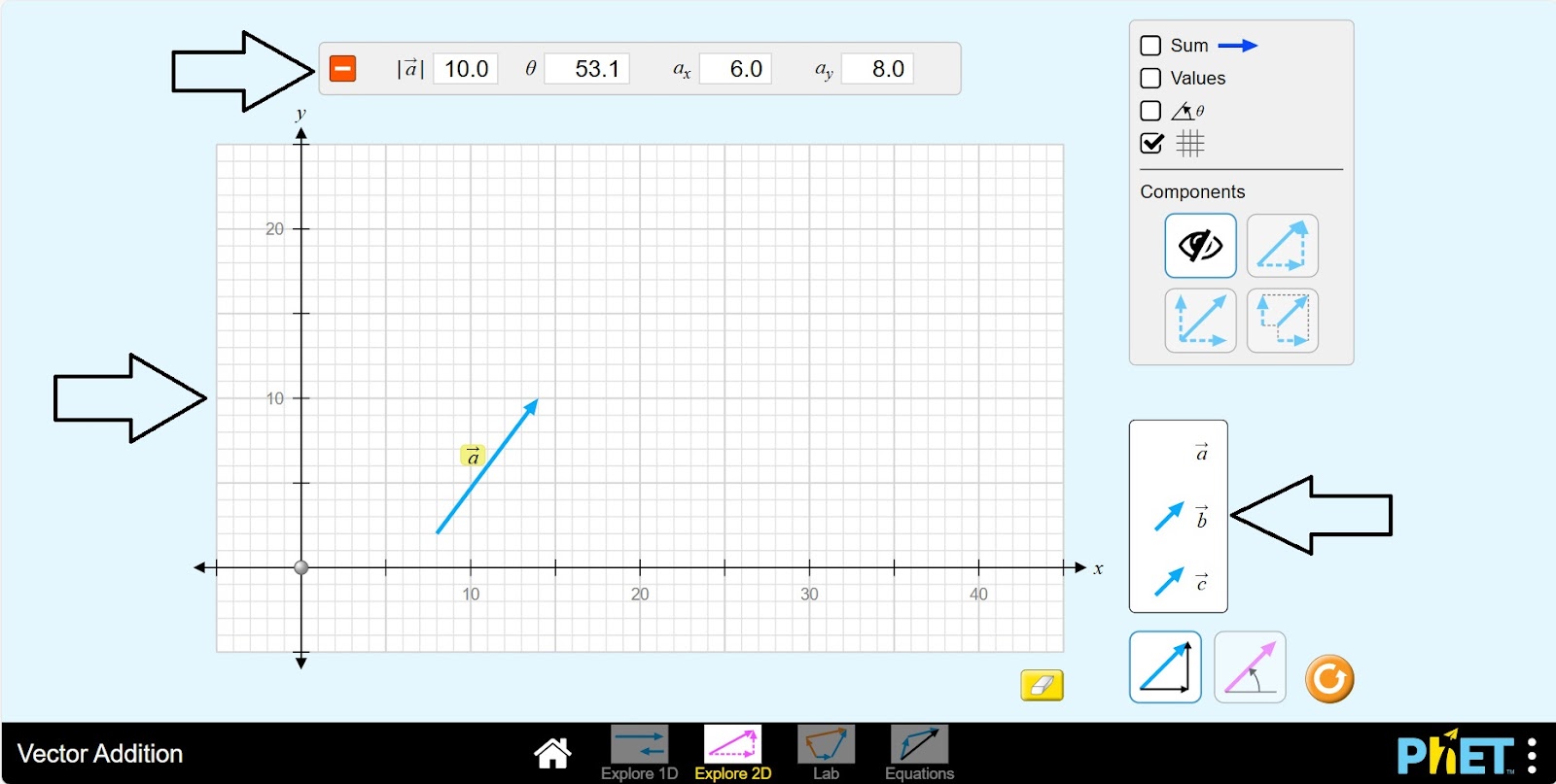 Шаг 10. Активируйте кнопки sum-добавить, values-размер, угол. Изучите различные макеты вектора a для ax, ay нажав каждую кнопку на панели компонентов.