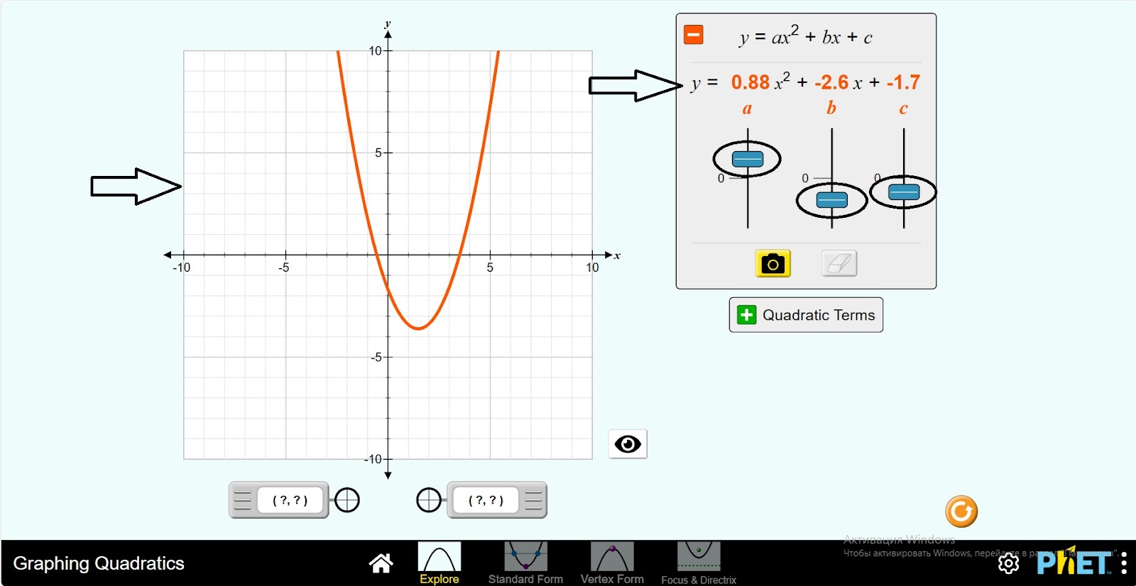 Симулятор Graphing Quadratics позволяет учащимся исследовать график квадратичной функции. На экране Explore (исследование) учащиеся могут использовать ползунки для изучения влияния каждого члена квадратичной функции на график параболы. На экране Standard Form (стандартная форма) основное внимание уделяется главной точке, оси симметрии. Учащиеся могут настраивать функцию, но значения ограничены целыми числами.