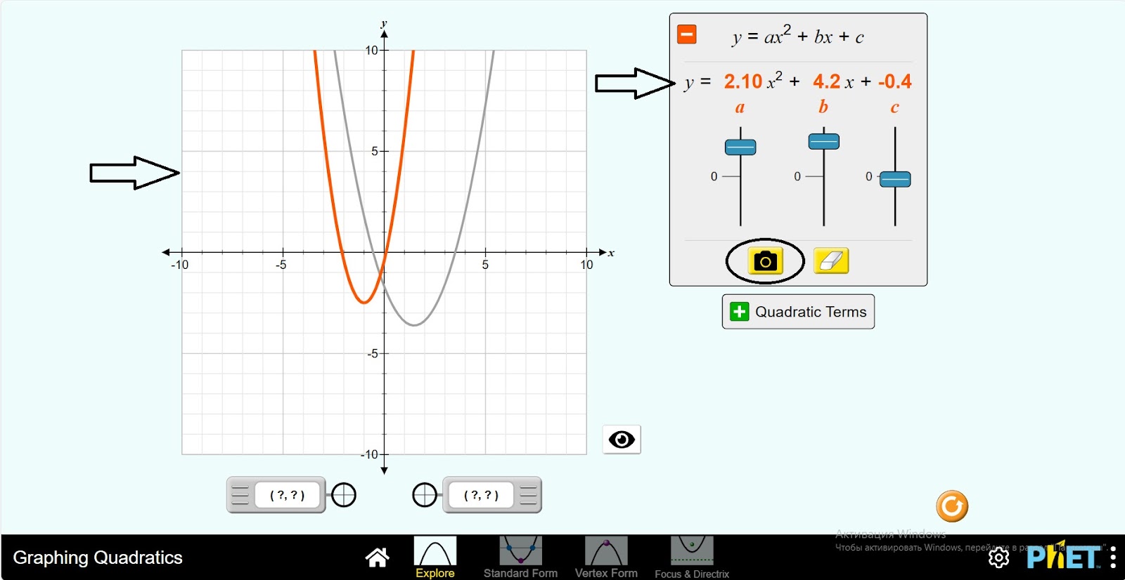 Шаг 6. Постройте различные уравнения и изучите их график, изменив значения a, 𝑏, 𝑐. Вы можете сохранить и изучить типы графики, нажав кнопку камеры.