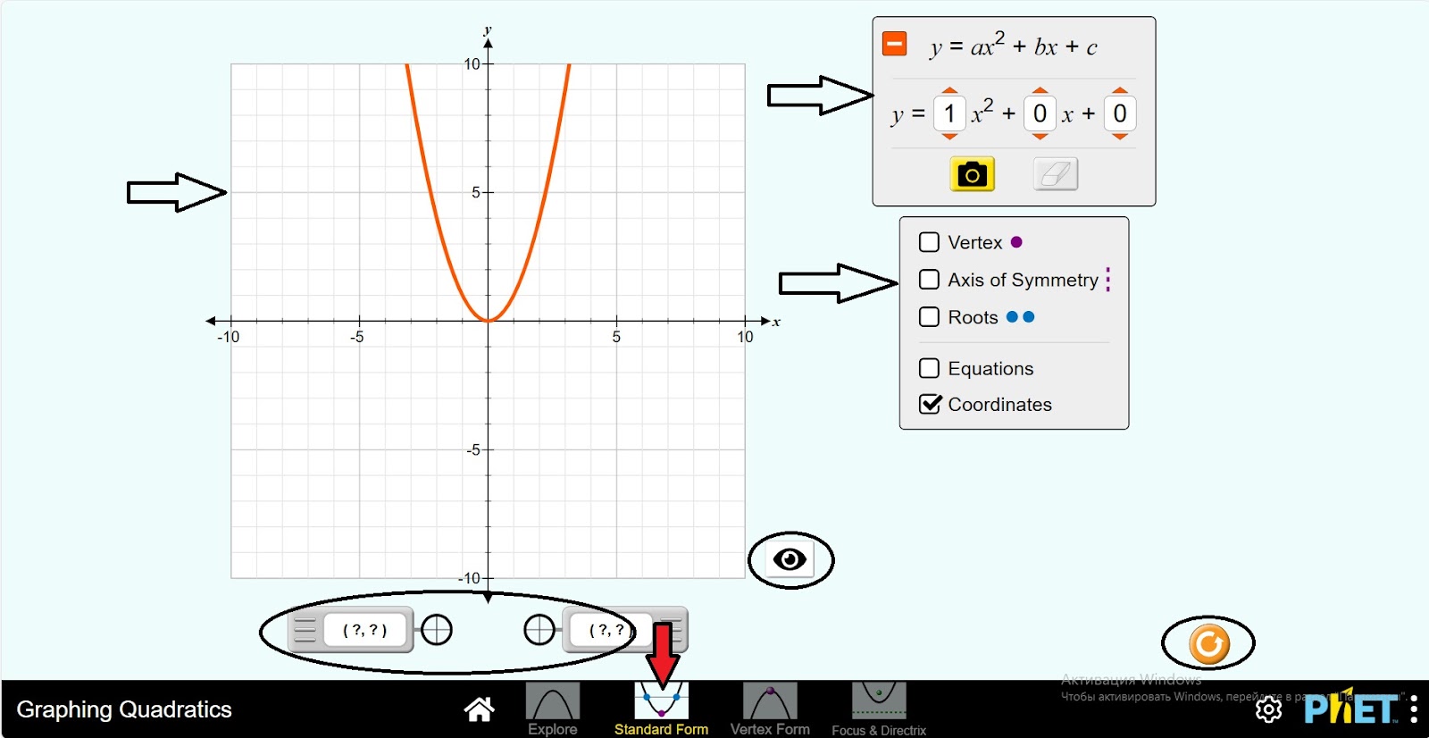 Шаг 1. Запустите симуляцию: вам будет предложено 4 различных режима: Explore, Standard Form, Vertex Form и Focus&Directrix. В этой работе вы будете работать с первыми двумя режимами. Запустите режим Explore.